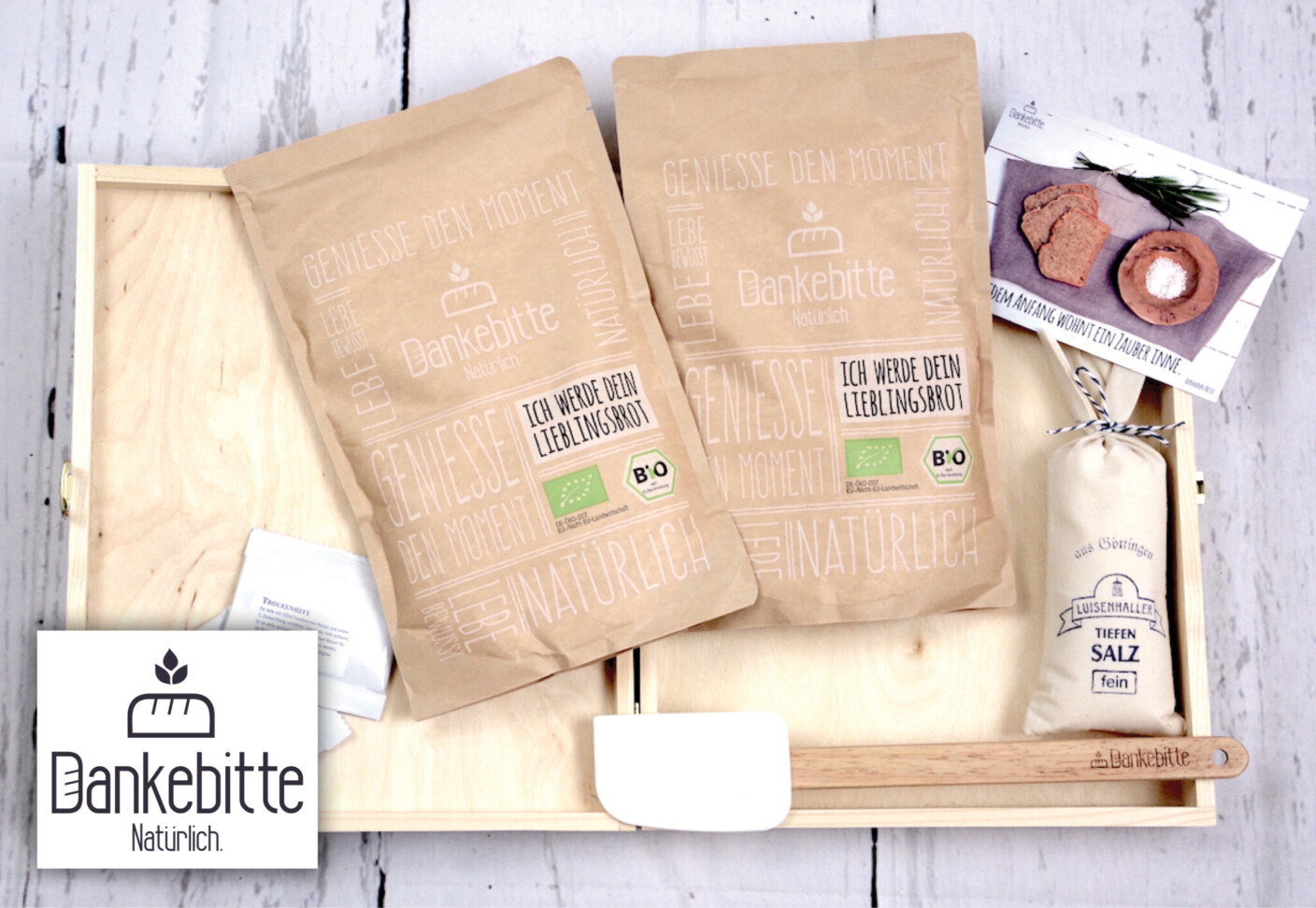 Der Gewinn des Tages: Die BROTundSALZbox „Alles Gute“ aus der Manufaktur von Dankebitte zum Selberbacken.