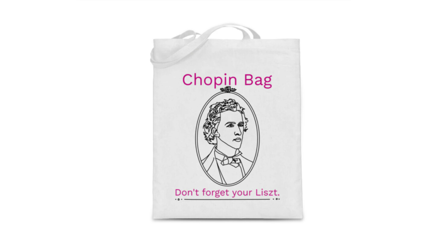 Wer sagt, dass Einkaufen keine Kunst ist? Mit der „Chopin-Bag“ aus 100 Prozent Baumwolle wird jeder Supermarktbesuch zu einem musikalischen Bekenntnis. Als kleiner Reminder: Don’t forget your „Liszt“.